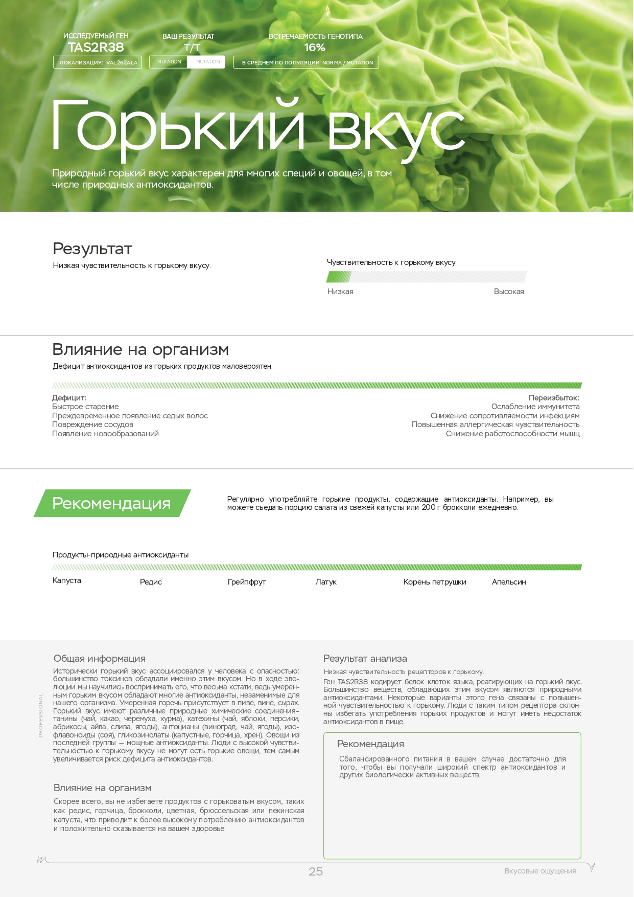 Исследование включает в себя 12 генов, отвечающих за противовирусный и противобактериальный ответ организма. Посмотреть гены и за что они отвечают можно в образце отчета.